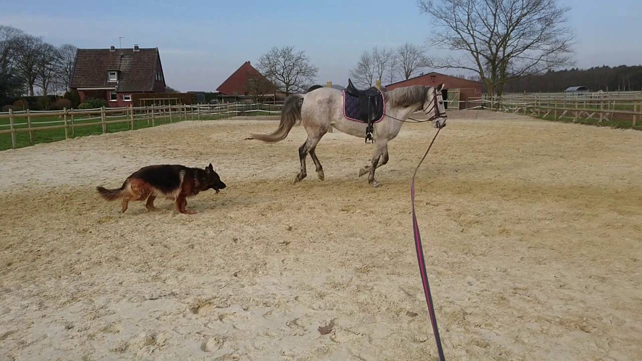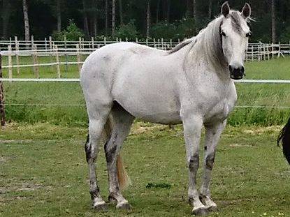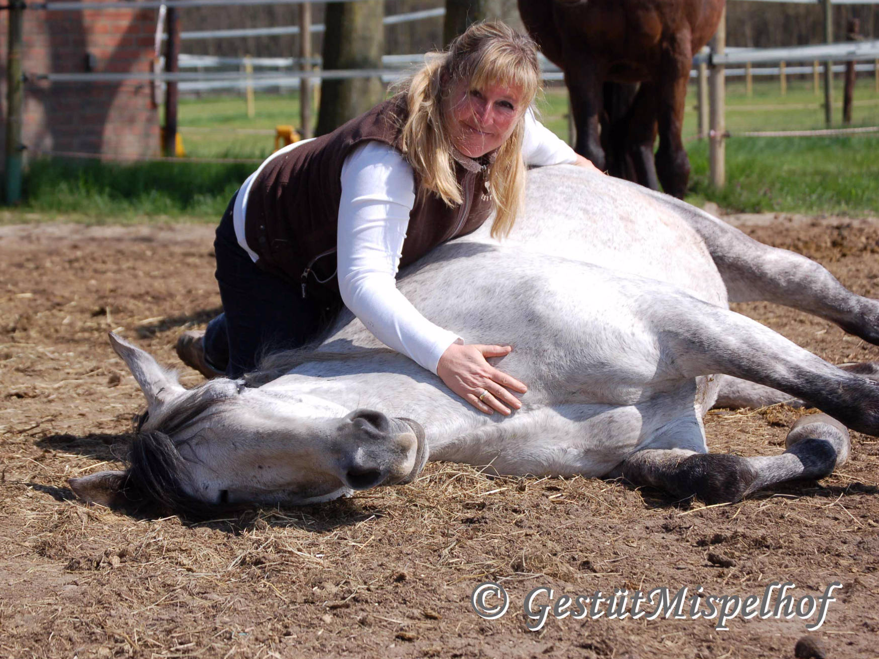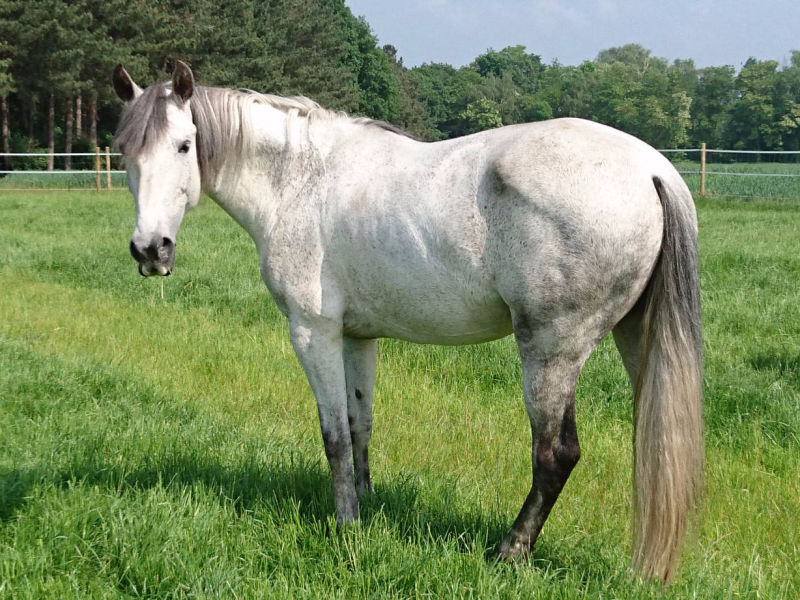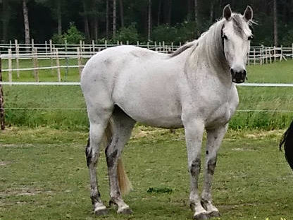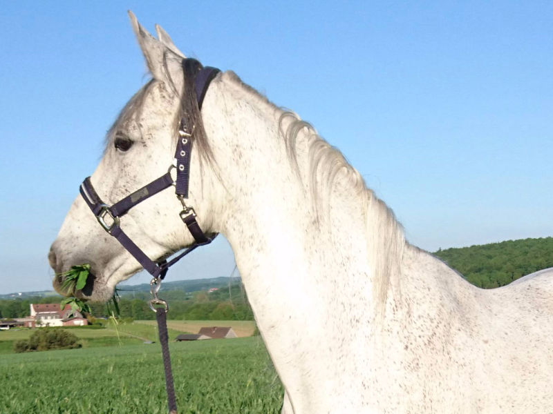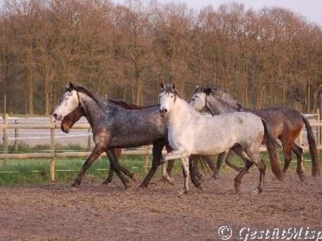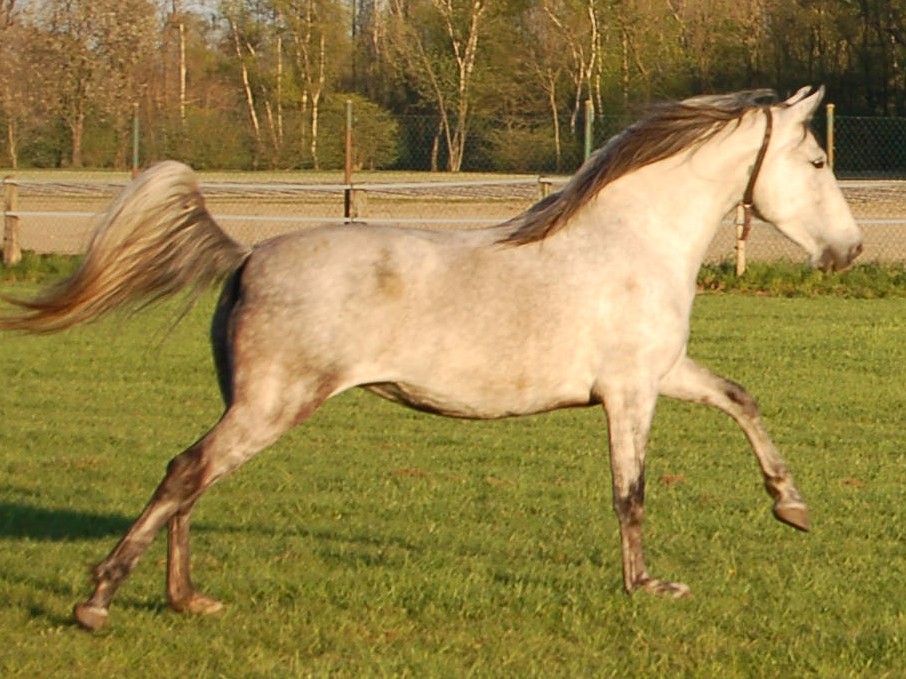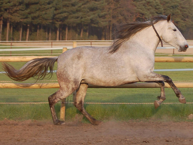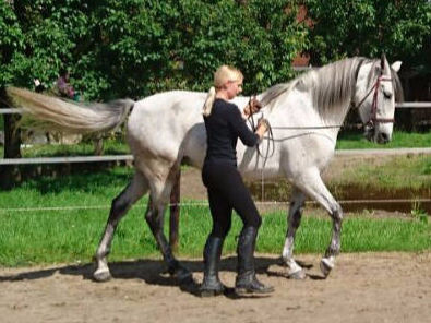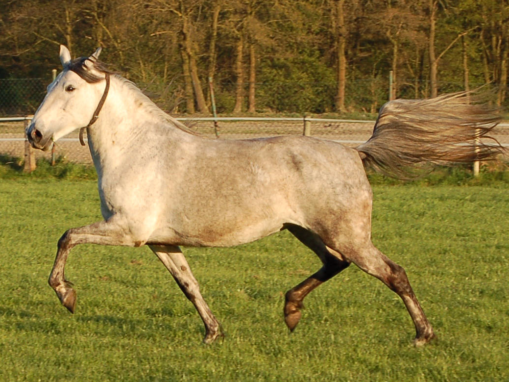 Ausbildungsstand: Schmiede- und Verladefrom, 3 sehr gute Grundgangarten, Trab mit hoher Knieaktion, Bodenarbeit, Handarbeit, Geländeerfahren, Geritten alle Seitengänge, fliegende Wechsel, Piaffe, Freiheitsdressur, Zirkuslektionen, Knien, Liegen, Spanischer Schritt