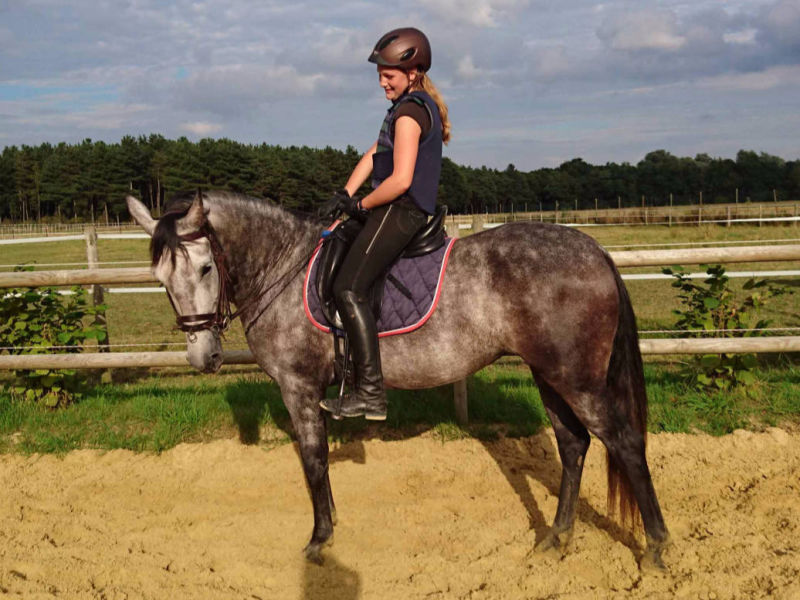 Solides Fundament und sehr gute Balance qualifizieren sie für Dressur und Working Equitation. Sie geht gerne ins Gelände und ist dort brav zu reiten. Zirkuslektionen machen ihr Spaß.